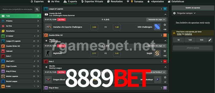 O 8889Bet oferece uma grande seleção de opções de apostas em e-sports com probabilidades competitivas